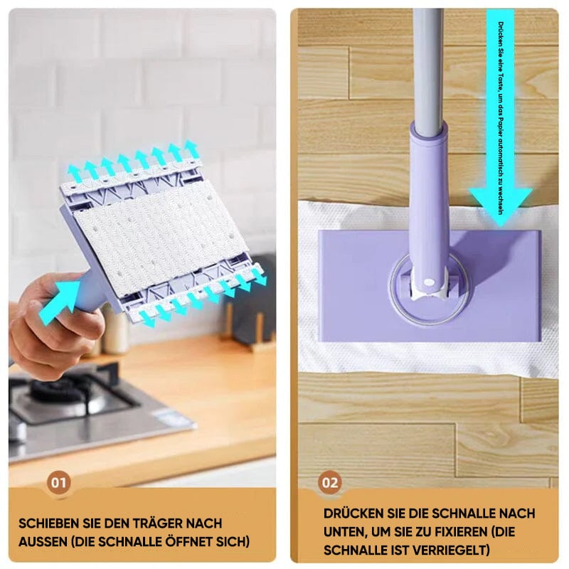 Freihändige Bedienung: Das Push-Pull-Griffdesign macht einen direkten Handkontakt beim Wechseln der Mopptücher überflüssig. Einfach den Griff nach unten drücken, um die Basis zu öffnen und das Tuch automatisch zu greifen oder zu lösen – so bleiben die Hände während des gesamten Vorgangs sauber.