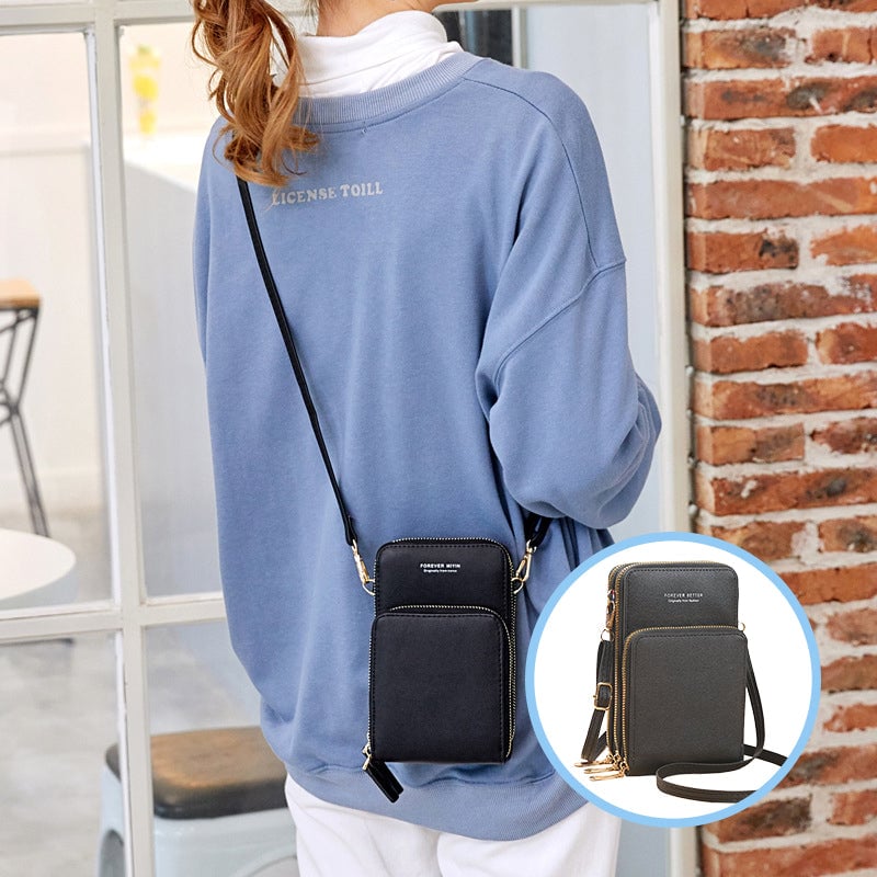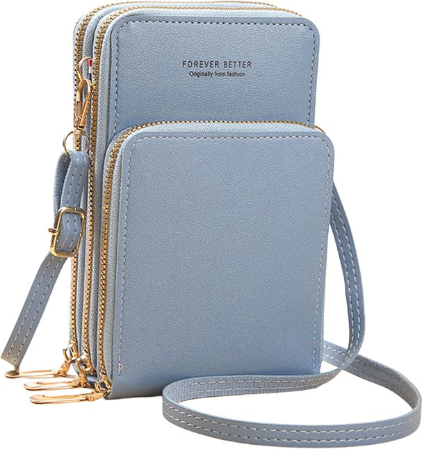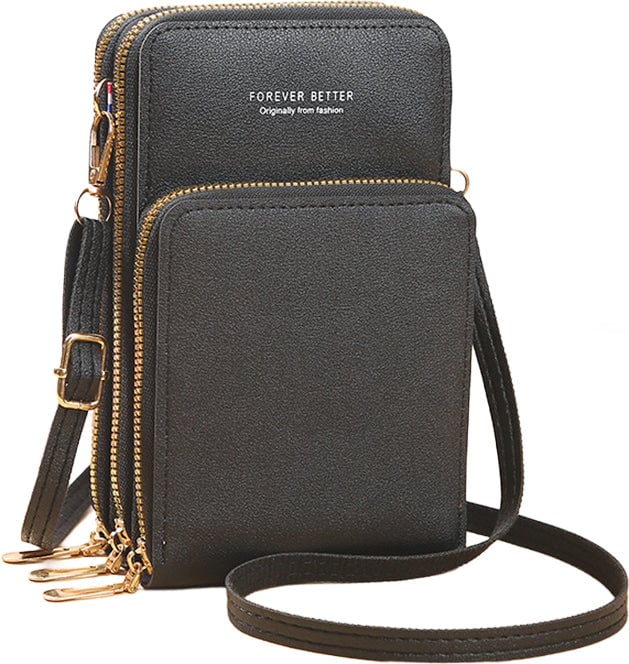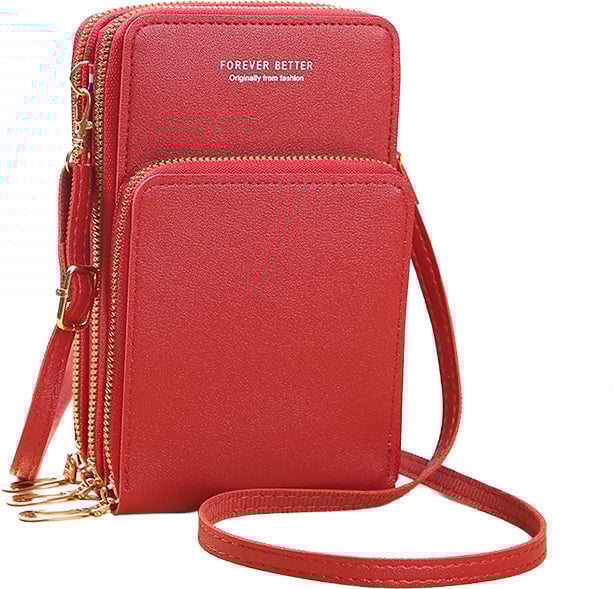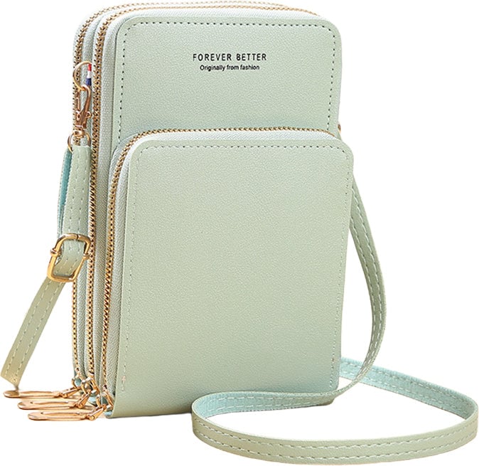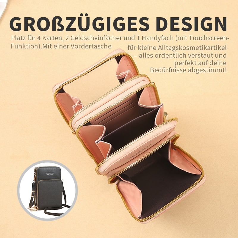 Mit mehreren Fächern, darunter Slots für 4 Karten, 2 Geldfächer und ein spezielles Touchscreen-Handyfach. Es gibt sogar ein Vorderfach für Make-up Essentials, das alles ordentlich und griffbereit hält.