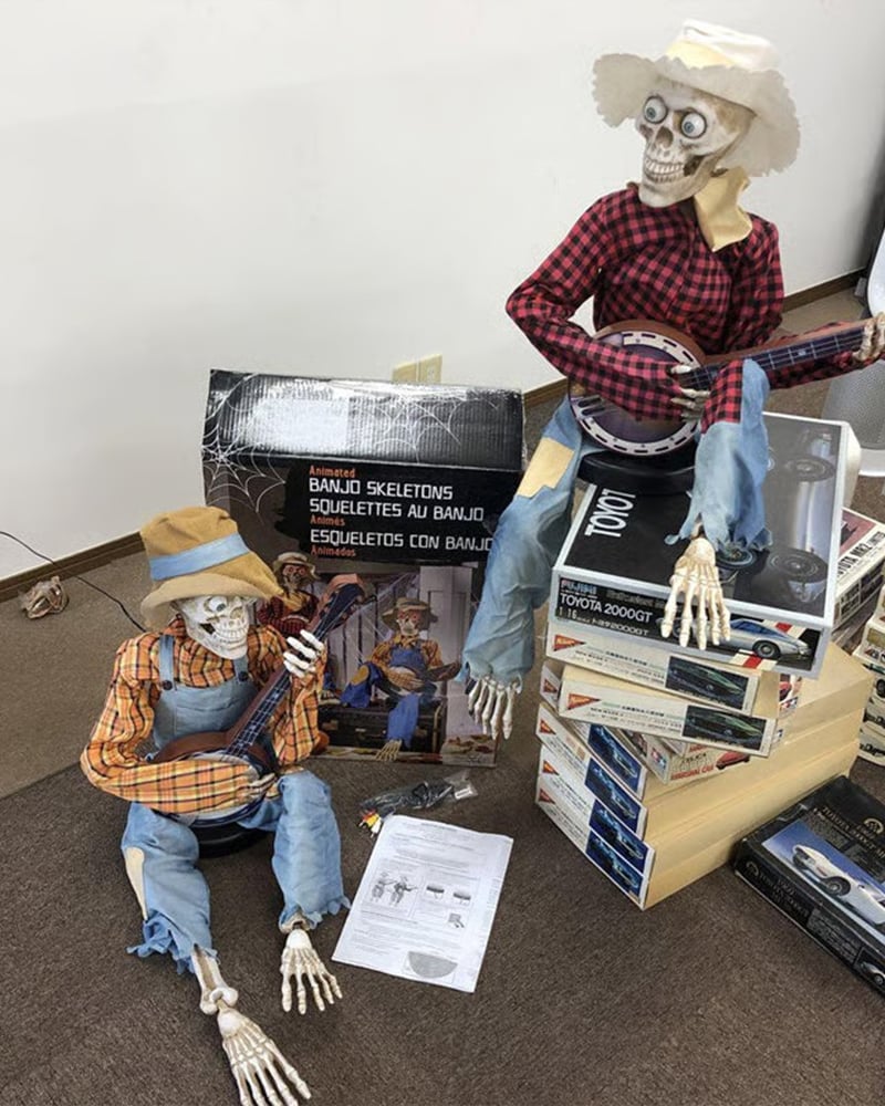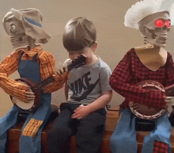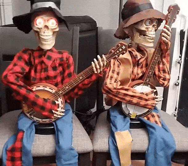 Unser animatronisches Skelett wird durch Bewegung oder Geräusche zum Leben erweckt. Perfekt für Spukhäuser, Halloween-Partys, Clubs und Themenparks – es macht Witze, spielt "Dueling Banjo"-Musik und bewegt seinen Kopf synchron zur Melodie!